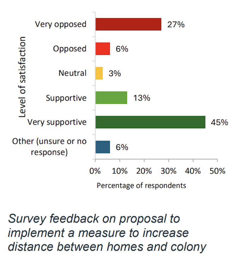 Survey results show that many residents are open to the proposed solution. Overall, 58 per cent of respondents supported or strongly supported measures to increase the distance between homes and the colony. Among residents living directly beside the parkland, support was higher, with 63 per cent backing the approach.